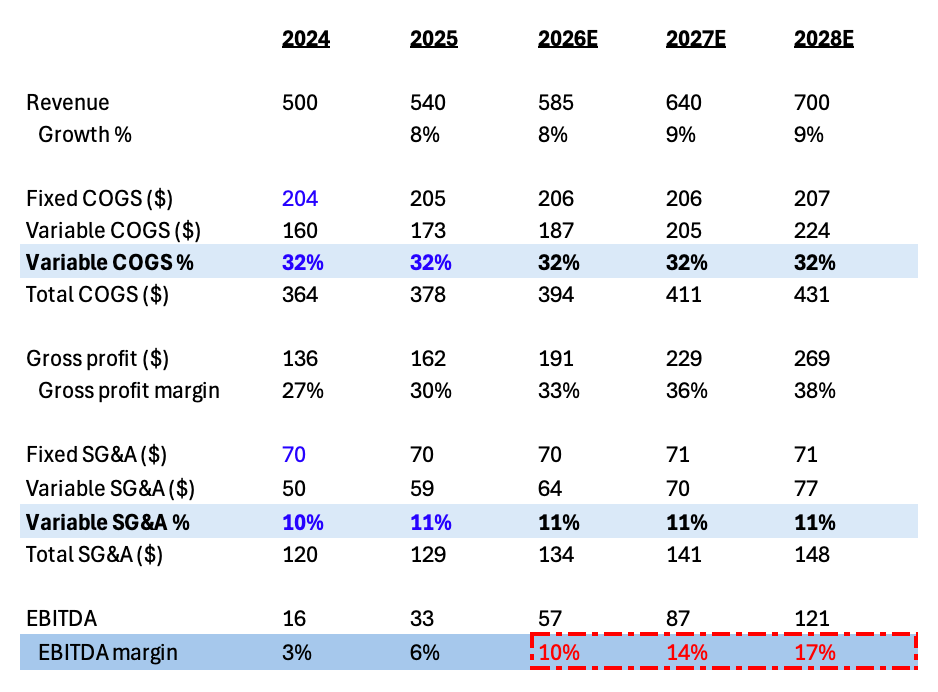 That 6% → 17% jump happens precisely because the cost base is only partially variable. Since a portion of the cost base stays fixed, each incremental dollar of revenue flows disproportionately to profit. In other words, you are seeing leverage on a partially fixed cost base (an important feature of operating leverage). In table 1, EBITDA margin stays flat at 6% because you treat all costs as variable.