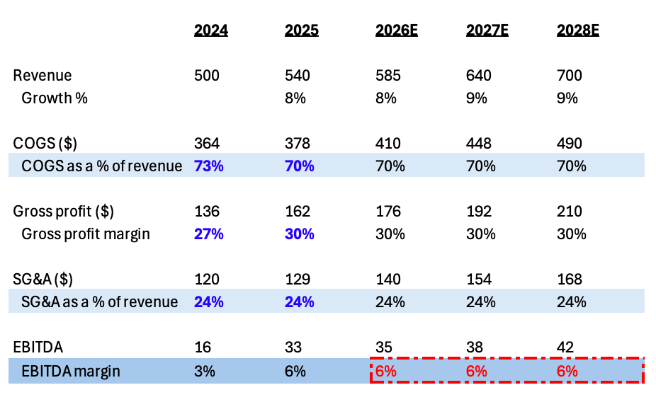That small structural change of splitting fixed vs variable costs compounds quickly. As revenue grows 8-9% per year, those mostly fixed dollars get spread over a larger base. Then you see gross margins expanding from 30% to 38% and EBITDA margins climbing from 6% to 17%.